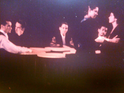 The original performers were Randolph Curtis Rand (USA), Pilar Álamo (Puerto Rico), Marcela Kingman (Chile) Miqueias Paz (Brazil), Sharon Mack (Scotland) and Luc Favrou (France). Each performer evolved their own invented language for the performance; developing distinct characters and possible languages. Much of the work involved learning and working within rhythmic and choreographic structures, so the performers had to work as actors, dancers and musicians. DINNER evolved out of the work I did with Ralf Ralf in collaboration with my brother Barnaby and Lars Goran Persson. The work we did around rhythmic breathing and invented language resulted in a performance - THE SUMMIT - on super-power politics that played in twenty countries and seemed to be understood whenever we played it, hinting at a near universal language of gesture, facial expression, music of speech - a language than can communicate relationships, emotion, status and character.